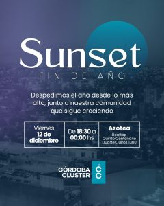 Te invitamos especialmente a participar del Sunset Fin de Año · Córdoba Cluster, un encuentro para disfrutar con tu equipo, brindar por lo logrado y seguir fortaleciendo los lazos que